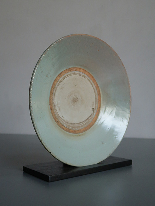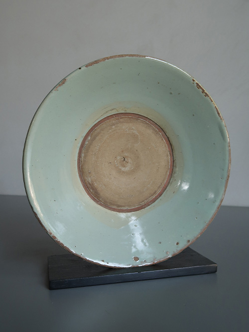 A decorative glazed pottery dish from the Sindh region, beautiful for its simplicity in shape, the spontaneity, directness, and propriety of its ornamentation, and the beauty of its colouring. This dish is very different from the commonly available unglazed pottery of Sindh and the Punjab. The glazed pottery of Sindh is made principally at Hala, Hyderabad, Tatta and Jerruck. The pieces are glazed mostly in turquoise, of the most perfect transparency, or in a rich dark purple, or dark green, or golden brown. Sometimes they are diapered all over by the pâte-sur-pâte method, with a conventional flower, the seventi, or lotus, of a lighter colour than the ground. Generally they are ornamented with the universal knop and flower pattern, in compartments formed all round the bowl, by spaces alternately left uncoloured and glazed in colour. Sometimes a wreath of the knop and flower pattern is simply painted round the bowl on a white ground. The glazed pottery of Sindh also inspired the Bombay School of Art pottery. Some of the best potters from Sindh were brought to the School to teach the pupils the technique.