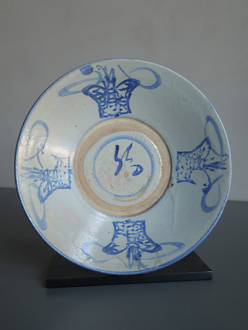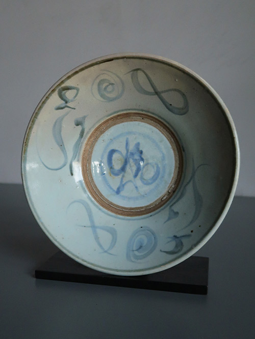 A beautiful earthenware dish Arabic inscriptions made for the Islamic markets. The inscription in the Center translates as ‘Allah the one, there is no partner to Him/ Muhammad is the Prophet of Allah/ Indeed you are the Conqueror.’ The top and bottom inscriptions on the outer border translate as ‘There is no God but Allah.’ The names of the four Caliphs, Abubaker, Umar, Usman and Ali also appear on the outer border in vignettes among foliate swirls.