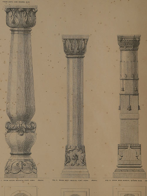 Original lithographs from the Jeypore Portfolio of Architectural Details prepared with the guidance of Col. S.S. Jacob CIE, Indian Army. It compares the designs of two marble pillars from the Agra fort with a sandstone pillar from Bindra Bun (Punjab). The Portfolio was issued under the patronage of H.H.Maharaja Sawai Madhu Singh, G.C.S.I. of Jeypore.