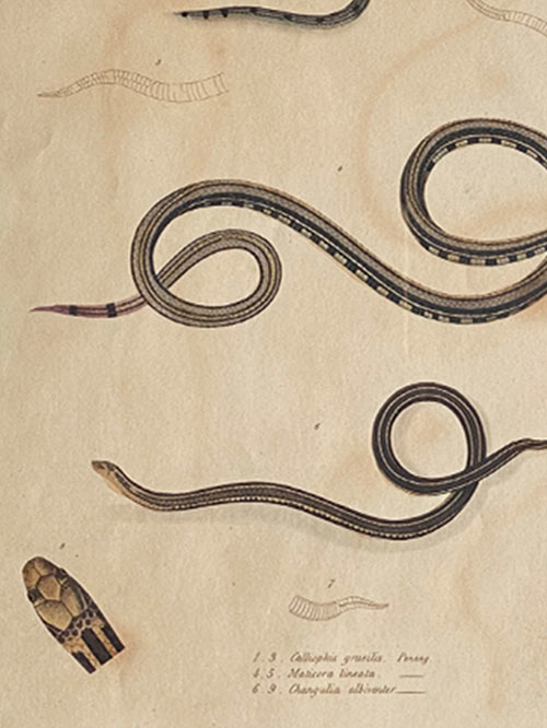 The Thanatophidia of India is a description of the venomous snakes of the Indian Peninsula and the physiological effects produced by their venom. These plates were drawn by students from the Govt. School of Art in Calcutta.