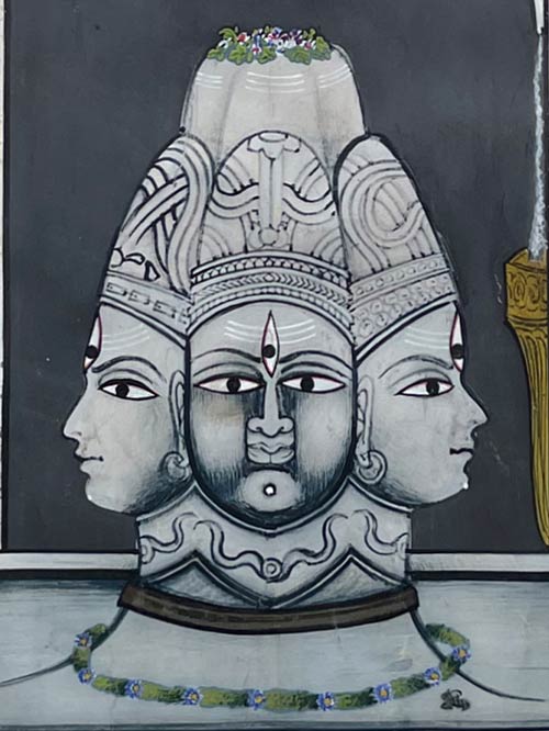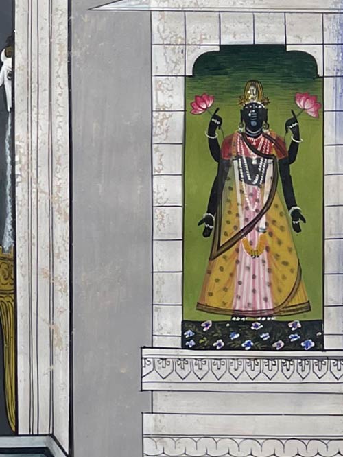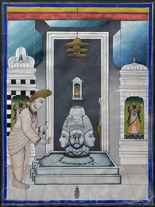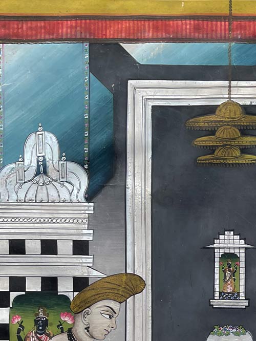 A striking painting depicting the four headed krishnamurti at the centre of the composition. A temple priest dressed in customary robes and headgear standing to the left performs puja holding an arti lamp and a temple bell. The interior has three marble niches each with a four-armed standing goddess holding lotuses. A three tiered golden lamp suspended overhead and a silver container in the foreground.