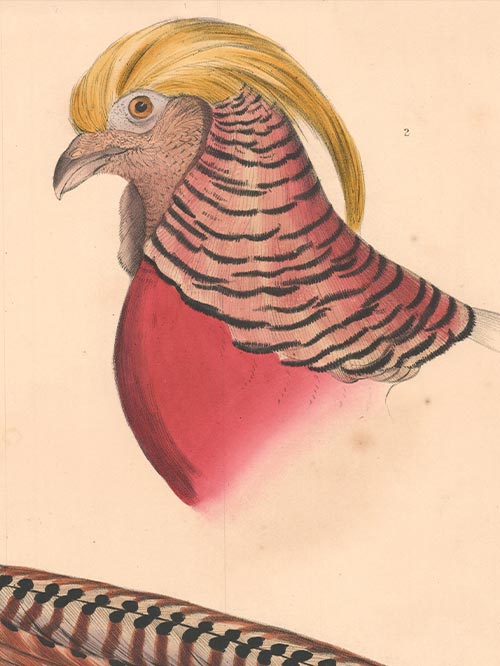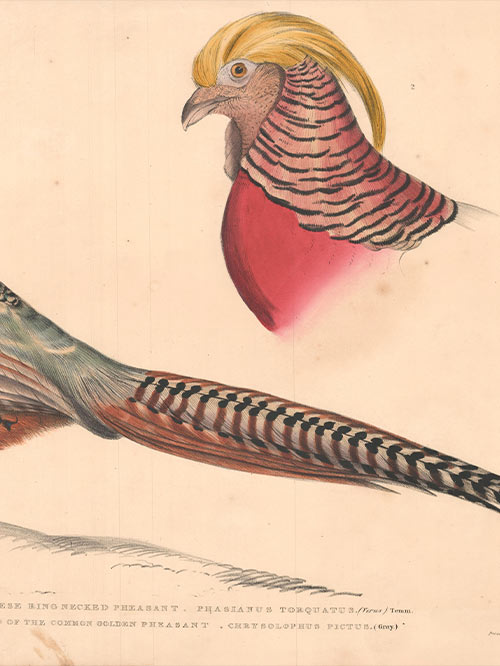 Captioned ‘1. Chinese Ring Necked Pheasant. Phasianus Torquatus. 2. Head of the Common Golden Pheasant. Chrysolophus Pictus.’
