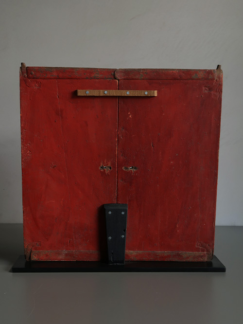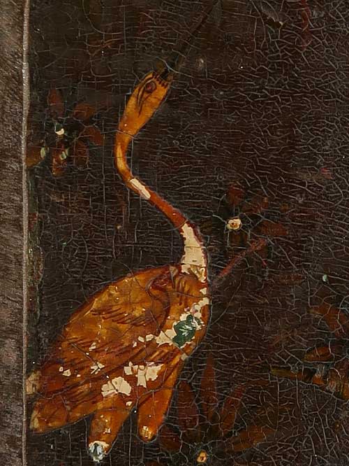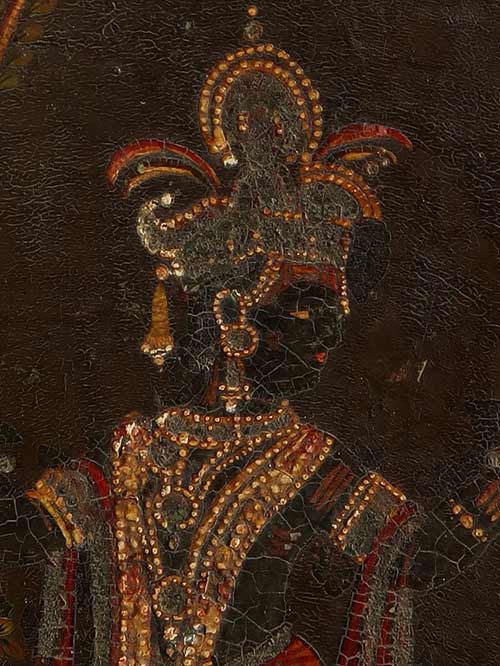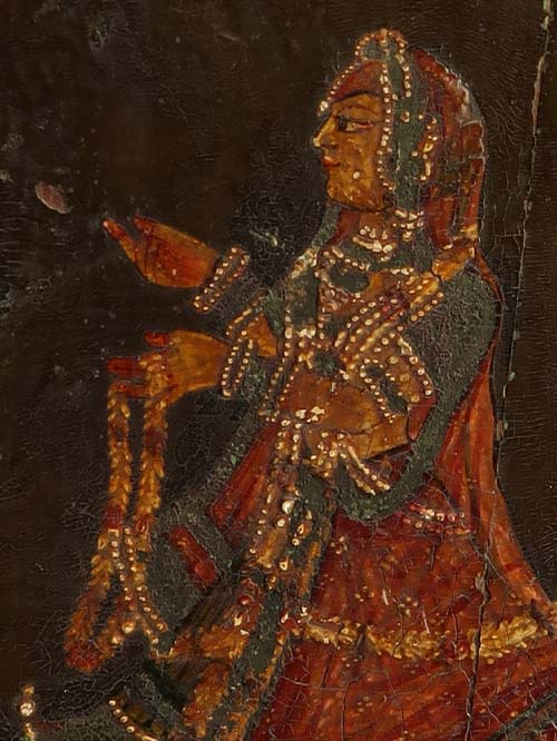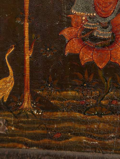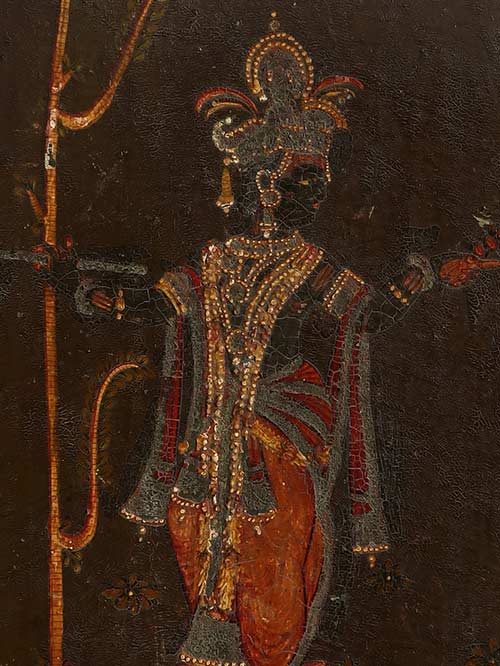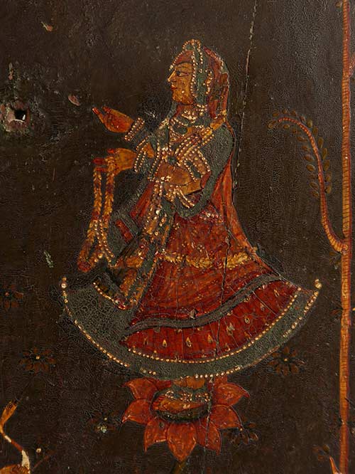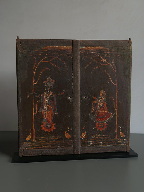 A beautiful pair of painted shutters from a household shrine. The shutter on the left depicts Krishna as Venugopala, standing on a lotus blossom upon a lake. Opposite him, Radha stands upon her own lotus, heavily bejewelled. She offers Krishna the floral garland which she holds. The nearby swans look upon the resplendent figures. ⁠