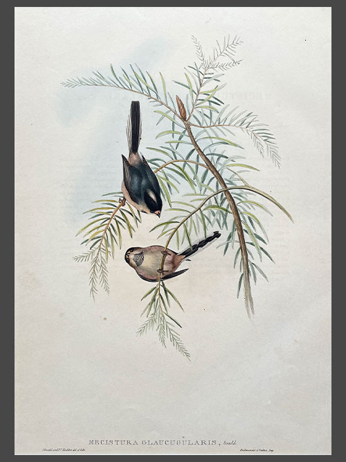 John Gould (1804 – 1881) was one of the most significant figures in 19th century bird art, both in his prolific output and the aesthetic beauty of his plates. He is credited with the publication of more than 3,100 coloured lithographs of bird species from various parts of the world. In his all-encompassing work, “The Birds of Asia,” John Gould includes species from all corners of the eastern world. Gould chose to record the bird life from an area which, with the exception of the tropical areas of the American continent, includes the widest, and most colourful variety of bird life to be found anywhere in the world.